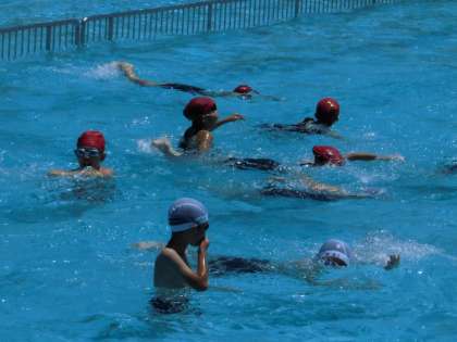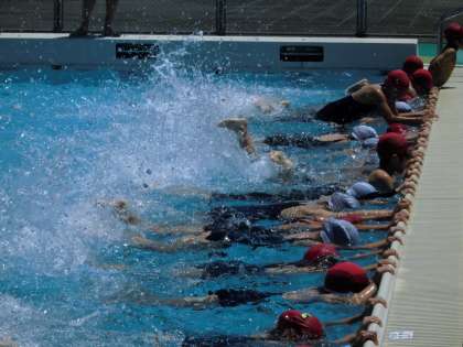 風が強く少し震えながらも、子どもたちは待ちに待ったという気持ちに溢れていて、とても表情もよく、明るい声がプールに響いていました。