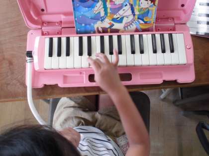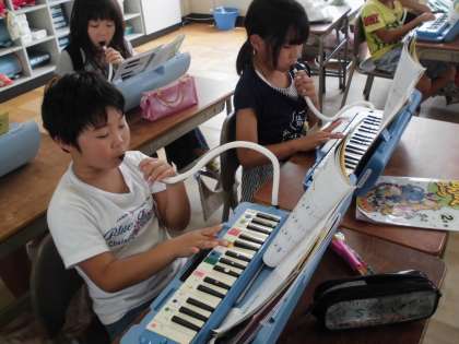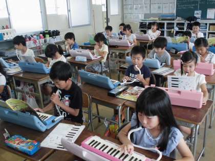 音楽の時間では、はじめに鍵盤ハーモニカの練習を行っています。はじめのうちは、指使いがむずかしく、「指くぐり」「指またぎ」がたどたどしい子が多くいました。「継続は力なり」で、今ではずい分なめらかに動かし、演奏できる曲目も増えてきました。2学期の学校公開では、是非ご披露したいと思います。