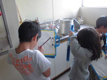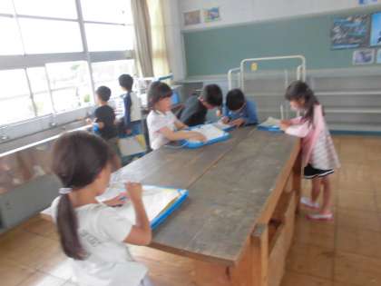 1年1組では、学校探検を行いました。特別教室を探検し、「わぁ、大きな冷蔵庫がある。」「先生、人体模型がこわいよ。」と言いながら、自分たちの教室とは違うところを一生懸命探すことができました。