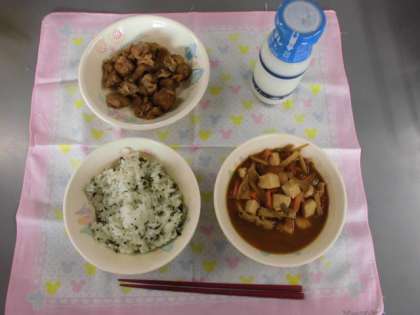 今日の豚汁には、体を作るもとになる豚肉や豆腐、油揚げ、味噌が入っています。また、エネルギーの元になるサトイモや体の調子を整えるゴボウ、大根、人参、長ネギも入っています。皆さんにとって大切な栄養素が沢山詰まっています。