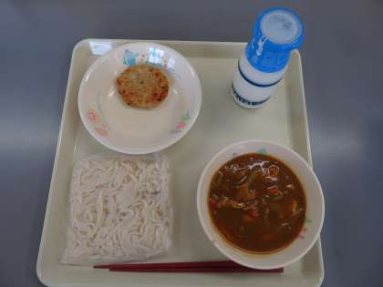 「南蛮」という言葉は、トウガラシや長ねぎを用いた料理に使われることがあり、今日のカレー南蛮ソフト麺にも入っています。長ねぎは斜め切りにしているため、いつもの給食の汁物に入っている長ねぎとは違う形です。