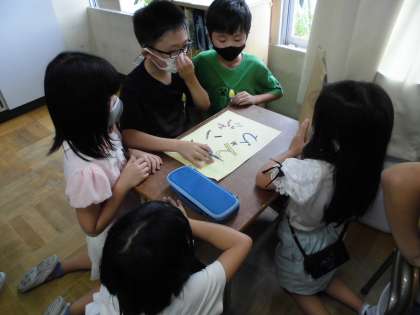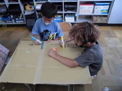 来月初めに、1年生の子を招いておもちゃまつりをします。そのための準備を一生懸命頑張っています。わくわくするような看板を作ったり、得点板を作ったりなど、それぞれのグループが工夫を凝らして準備を進めています。