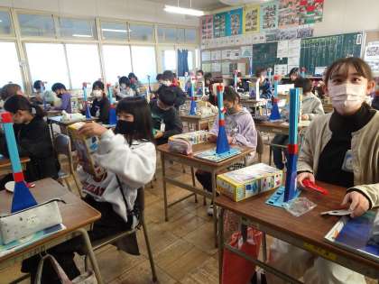 理科の授業では、ふりこの実験が終わり、おもちゃ作りをしている場面です。ふりこの性質を使った遊びに盛り上がっていました。
