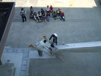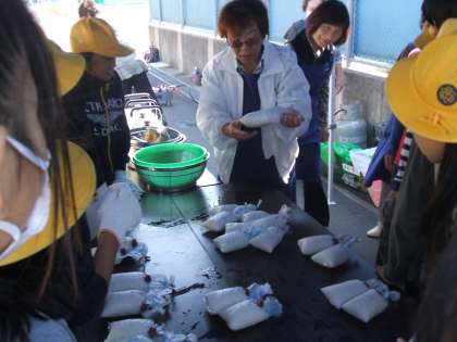 赤十字一宮支部の方々のご協力で、ビニル袋の中にお米を入れておにぎりを作る炊き出し体験と救助袋の体験をしました。