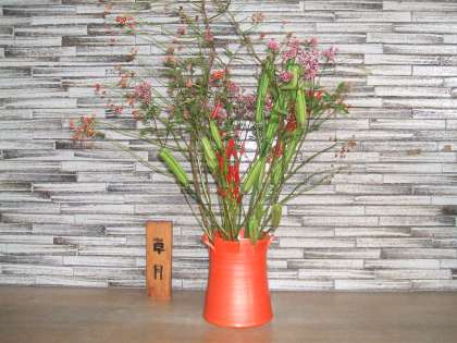 今日、吉田先生がいけてくださったのは、『フジバカマ・野バラの実・ユリの実・赤とうがらし』です。“秋の趣”を感じさせてくれる素敵な花です。