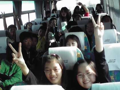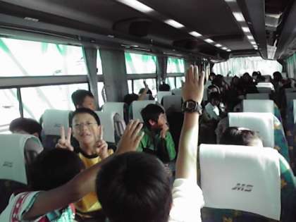 写真は1組のバスの中です。高速道路に入るとすぐに用意していたバスレクがはじまりました。