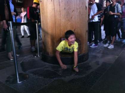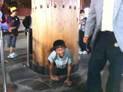 東大寺の柱の穴をくぐりました。とても楽しんでいます。
