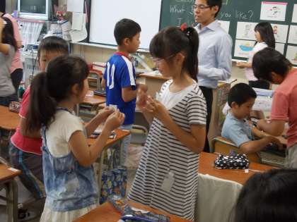 その後、カードを使ってゲーム形式で子ども同士で質問をし、質問に答える練習をしました。