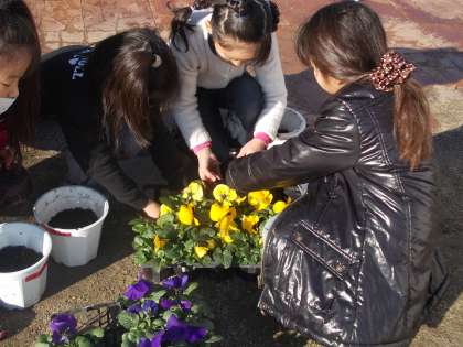 1枚目は、卒業式の式場を飾るパンジーの鉢植えの様子です。気温が低く手がとっても冷たかったけど、お世話になったお兄さんやお姉さんの卒業を祝うために一生懸命植えました。