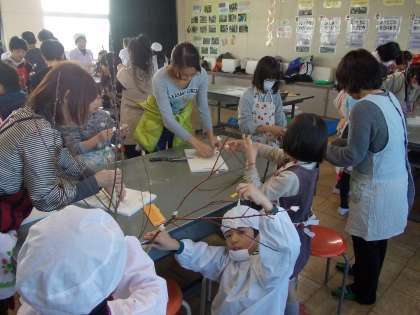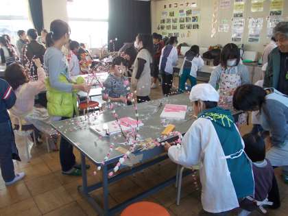 今日の授業後、懇談会の時間と並行して食育のボランティアの大島さん、森田さん、河口さんに指導をしていただきながら、親子で「花餅づくり」をしました。