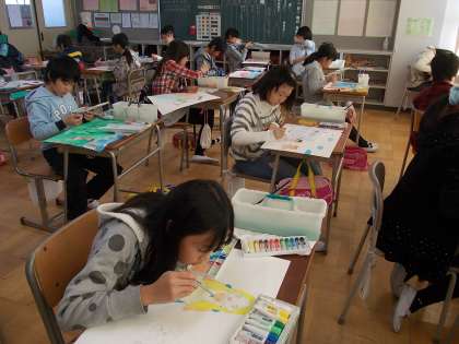 お話の場面の雰囲気や様子がよく伝わるように色を選び、色の重なりを考え、色の濃淡を工夫しながらもくもくと仕上げていました。