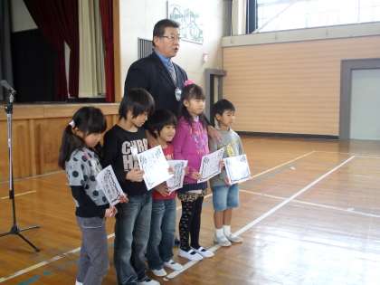 最初に、「暗唱名人」をがんばっている子どもたちと水泳で優秀な成績を収めた子の表彰をしました。