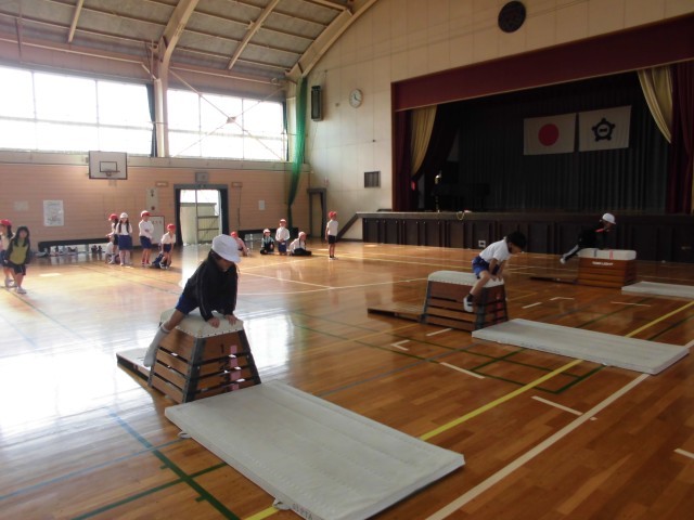 体育の授業で縄跳びと跳び箱を練習しています。