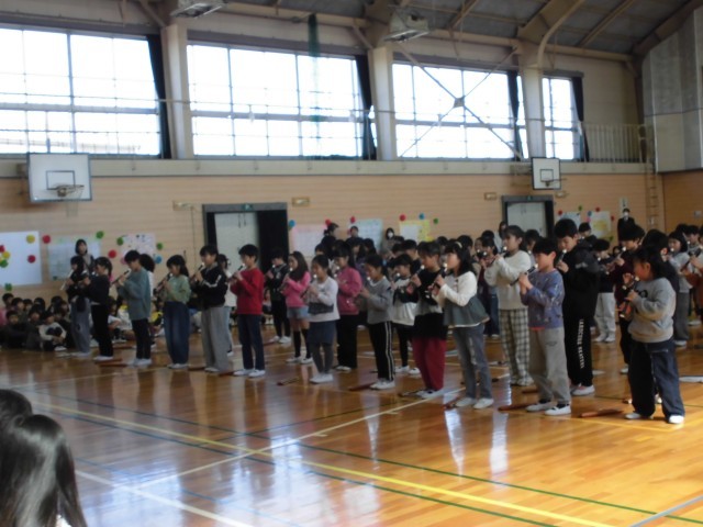 さらに、「6年生を送る会」では、これまでお世話になった6年生に感謝の気持ちを伝えました。今年から取り組んでいるソプラノリコーダーで「思い出のアルバム」を心をこめて演奏し、掛け声で感謝の言葉を届けました。練習の成果を発揮し、気持ちのこもった発表となりました。