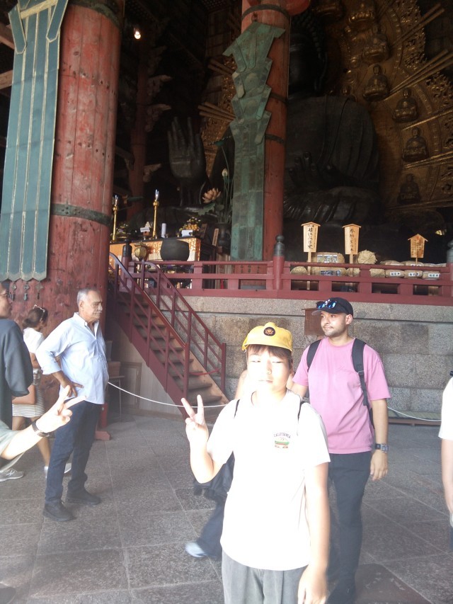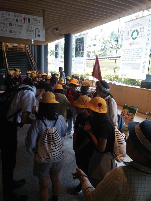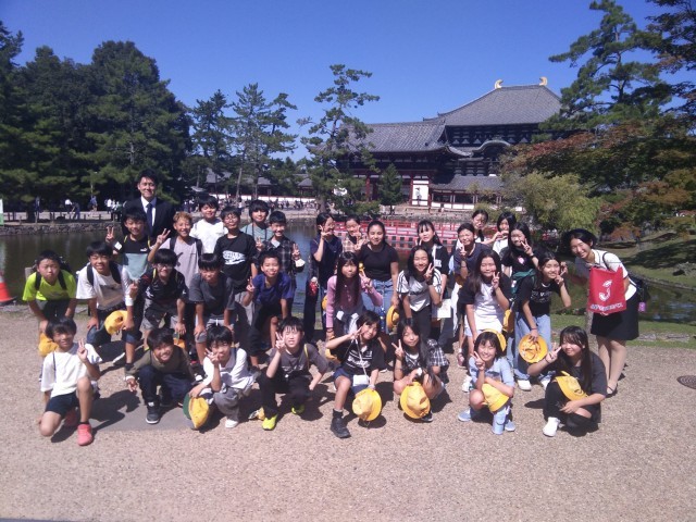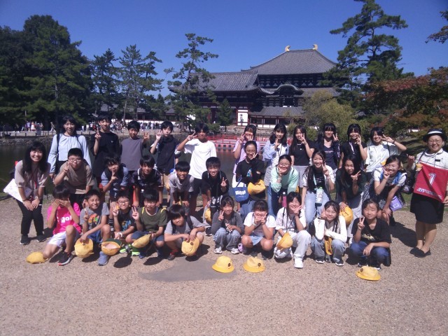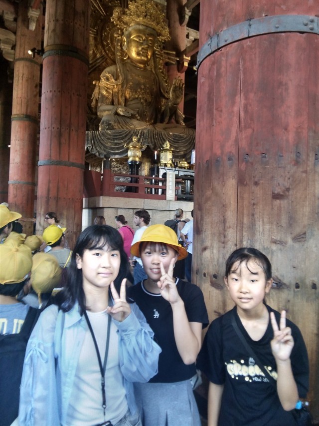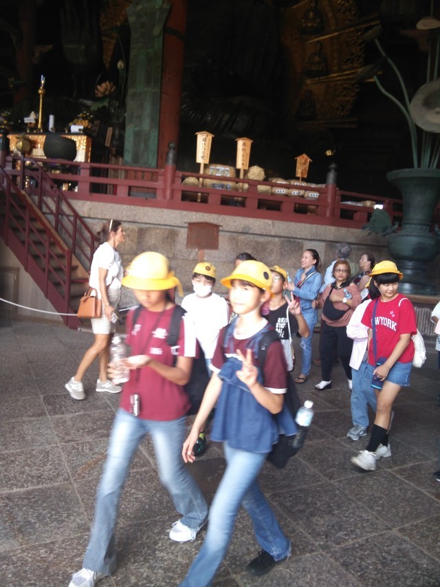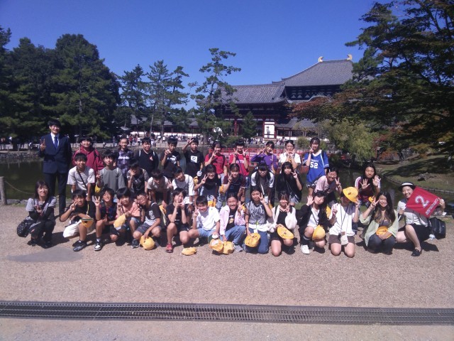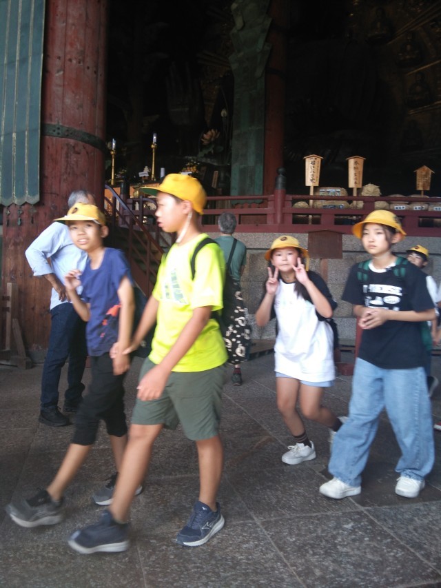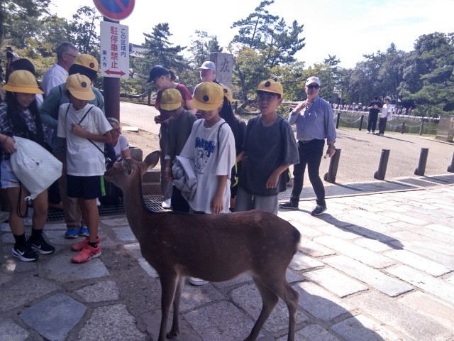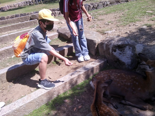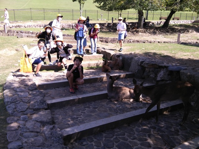 班別行動を行っています。鹿にせんべいをあげたり、お土産を探したりしています。
