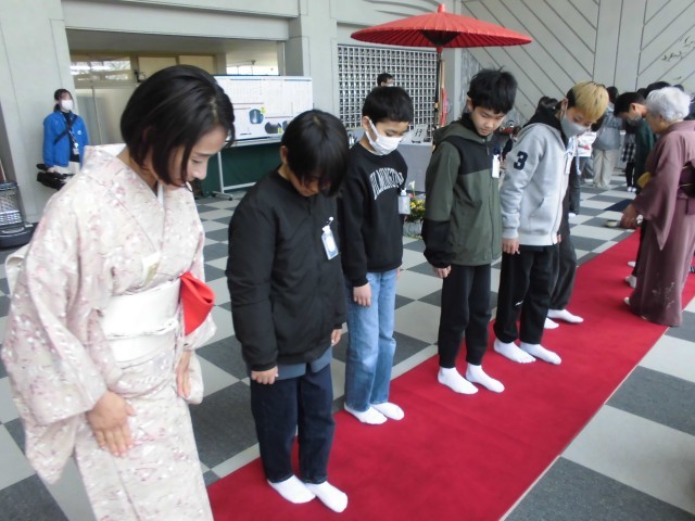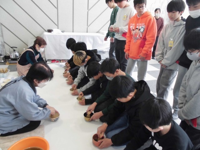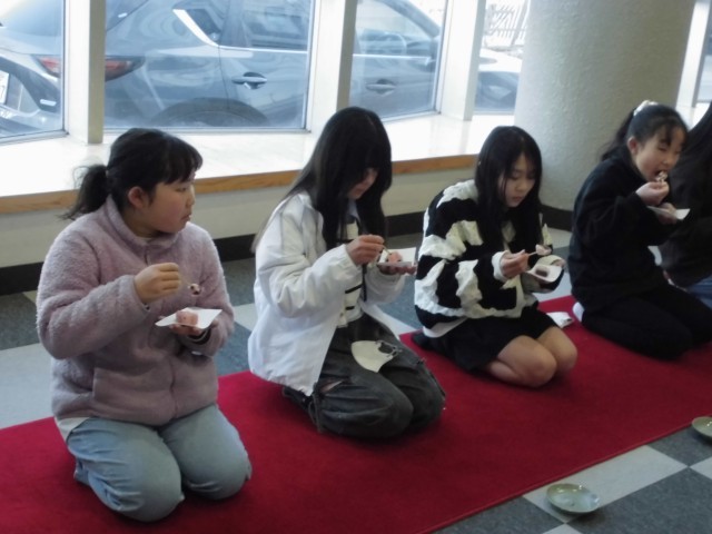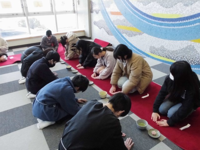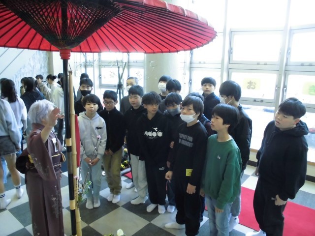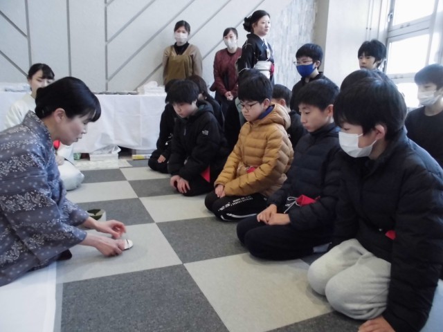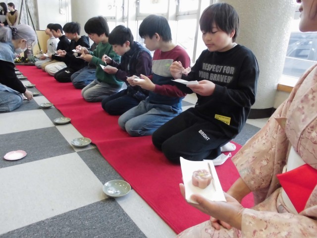 本日、6年生では卒業茶会が催されました。「忙しい時期にほっと一息できるように」という地域の方や保護者の方のご協力で、楽しくすてきな時間を過ごすことができました。多くの方に素晴らしい時間を作っていただけたこと、心より感謝申し上げます。ありがとうございました。写真は1組の茶会の様子です。