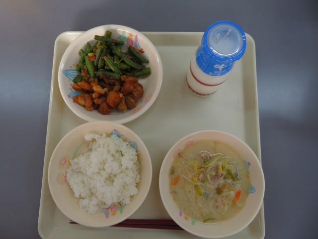 ・ご飯・牛乳・たらのおかか揚げ・いんげんのごま和え・ぶた汁・納豆