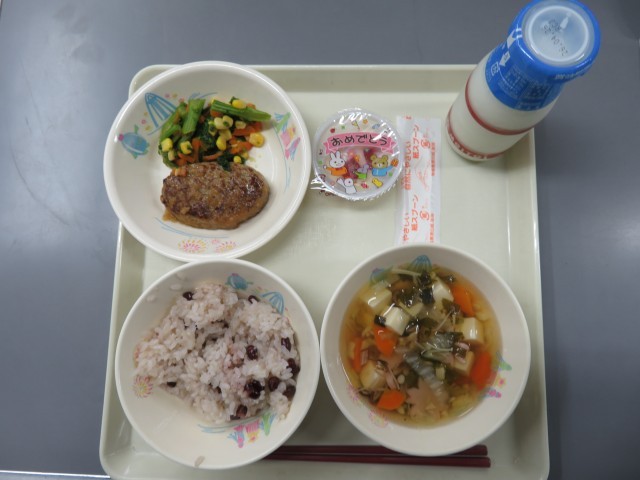・赤飯・牛乳・ハンバーグのおろしがけ・菜の花和え・桜のすまし汁・お祝いデザート