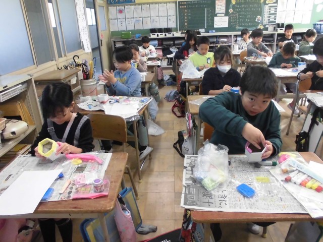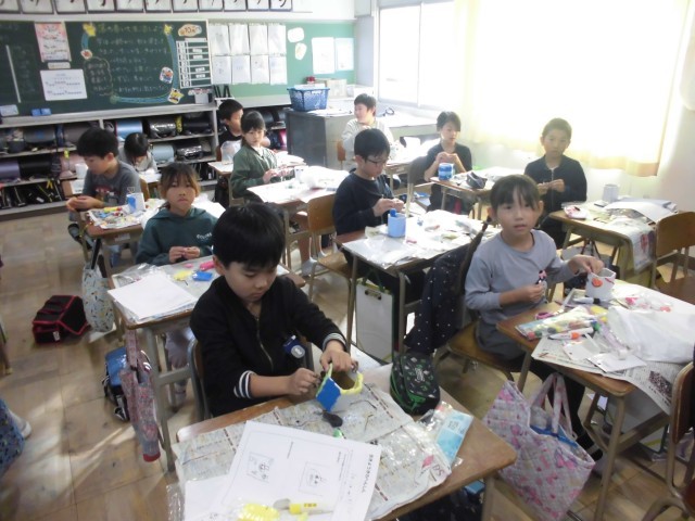 カラフルな紙粘土を容器につけて素敵な作品にしていました。