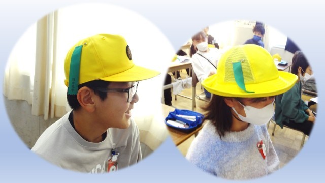 修学旅行にかぶっていく黄色い帽子に緑のリボンをつけました。修学旅行中は同じような黄色い帽子の学校が多数いるので、見分けるための目印となります。明日はいよいよ出発!