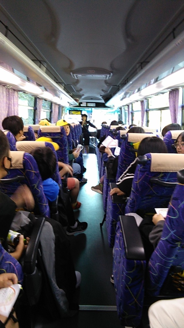 バスの車内では、ガイドさんのクイズや流す曲のリクエストをして楽しんでいます。