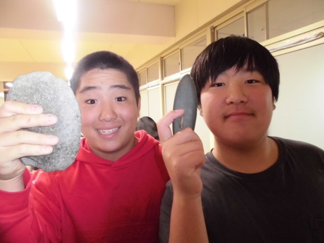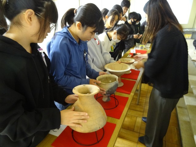 触ってみる体験では、土器の重さや、石器のギザギザ、表面の滑らかさなどを触って実感することができました。
