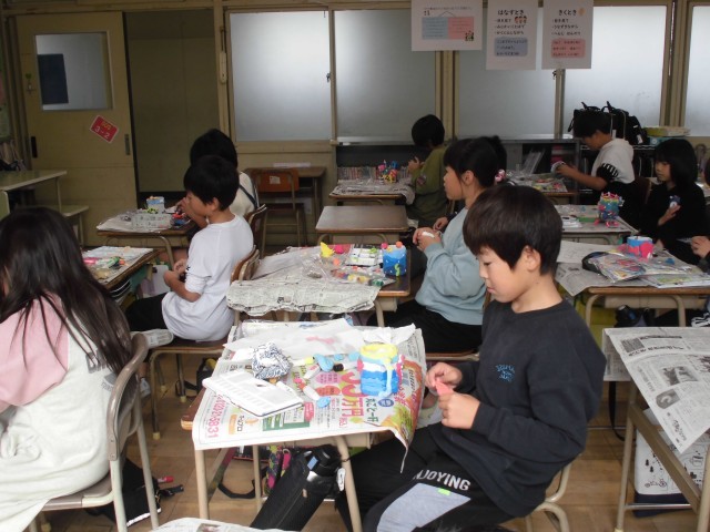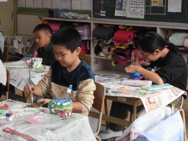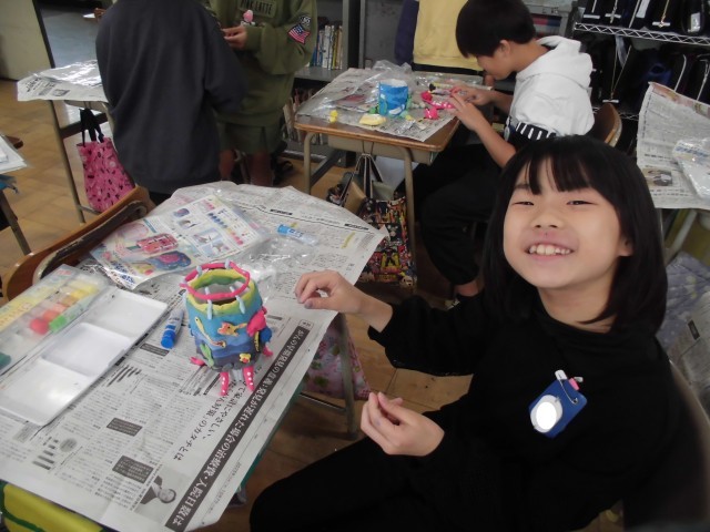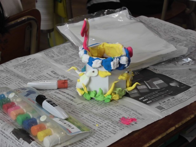 持ち手を付けてマグカップのようにしたり、土台をつけて工夫したりと立体的に粘土を工作してとてもかわいらしい作品が出来上がりました。