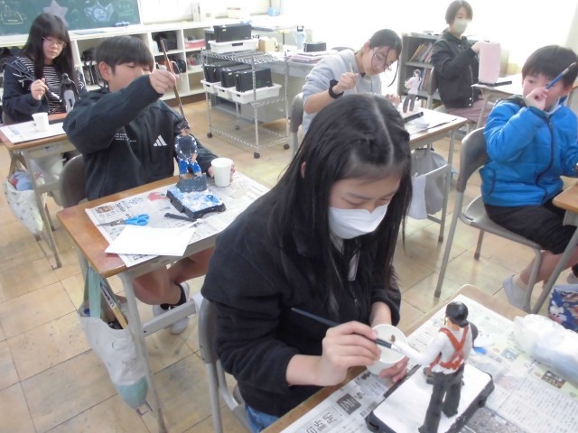 骨組みのポージングを考え、粘土で肉付けをし、色を塗り、いよいよ今日はニス塗りを行いました。