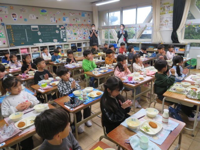 牛乳がいっぱいだ!などみんな楽しい給食の時間になりました。