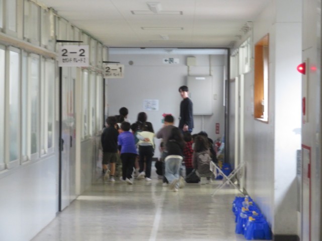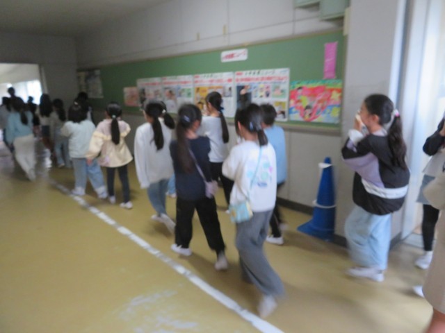 姿勢を低くし、ハンカチなどで口を覆いながら、「お(おさない)は(はしらない)し(しゃべらない)も(もどらない)ち(ちかづかない)」の5つの約束を守って避難経路の確認をしました。万が一に備えて、訓練の段階から真剣に取り組む姿はとても頼もしく感じられました。