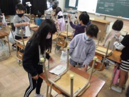 今日は、6年生のお兄さんたちと一緒に、ちょびボラ活動を行いました。教室の机や椅子を、一年間の感謝の気持ちを込めて掃除しました。机の脚などを二人で協力して掃除したり、床や配ぜん台も掃除したりするなど、熱心に取り組む姿が見られてうれしかったです。