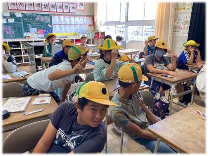黄色い帽子に緑のリボンをつけました。修学旅行中は同じような黄色い帽子の学校が多数いるので、見分けるための目印です。明日はいよいよ出発!交通安全や健康管理にも気をつけましょう。