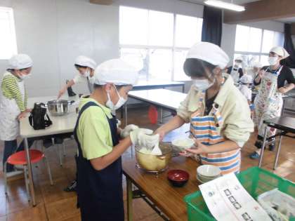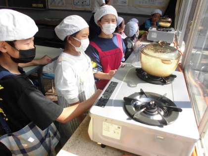 今日は2組の調理実習の日でした。ご飯を鍋で炊き、お味噌汁も煮干しからだしをとって作りました。朝から米を研いだり、下準備や片付けの量も多かったりとやることが多かったですが、協力して実習に取り組むことができました。