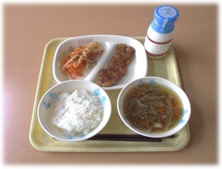今日の献立は、ごはん、牛乳、さんまのかば焼き風、もやしのごま酢和え、沢煮わんです。