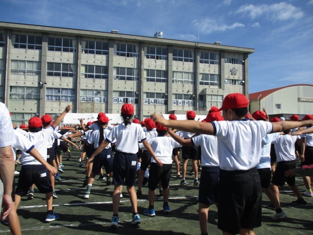 運動会に向けて、全校練習がありました。今日はまず、開会式、閉会式の練習と、今日に合わせて準備体操を行いました。本番に向けて、頑張っています。