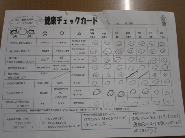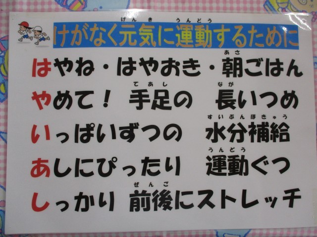 運動会準備バージョンの健康チェックカードの実施ありがとうございました。今年の夏は、大変暑く9月に入ってからも高温が続きました。運動会準備バージョンの健康チェックカードを家庭で実施していただいたおかげで、学校で体調を崩す子が減りました。また、練習に集中しています。そろそろ疲れが出やすい時期です。各クラスには、けがなく元気に運動するために「はやいあし」のポスターのもと運動会練習に取り組んでいます。「は」早寝・早起き・朝ごはん「や」やめて!手足の長いつめ「い」いっぱいずつの水分補給「あ」あしにぴったり、運動ぐつ「し」しっかり前後のストレッチです。ご家庭でもご確認ください。10月11日 運動会にむけて体と心の調子を整えましょう。