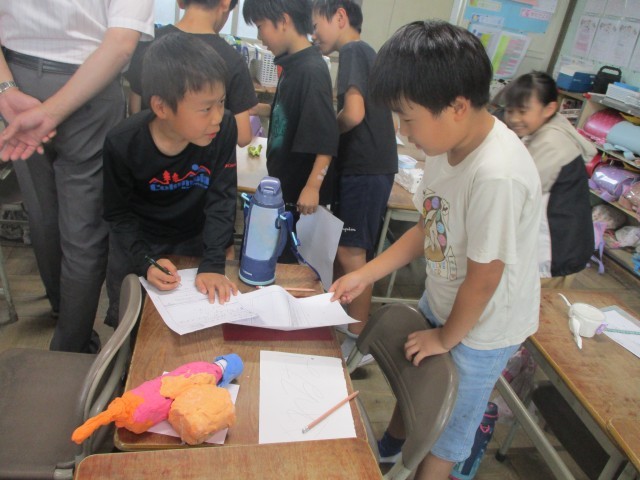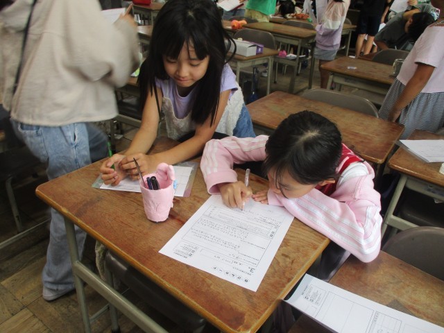 空き容器を組み合わせて、生活に使えるものに変身させました。カラフルな紙粘土や、ピーズや貝殻などの飾りを使って、思い思いの作品に仕上げました。今日はその作品をみんなで鑑賞し、よいところや工夫してあるところを見つけ合いました。