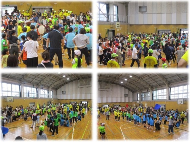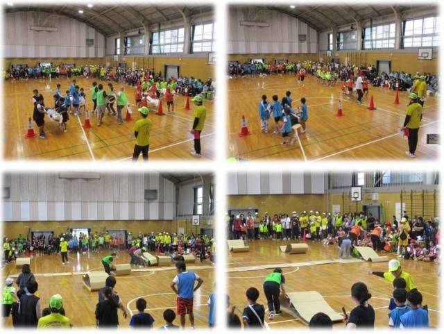 「担架リレー」は人形を担架に乗せ、けがのないように運びます。「ダンボールキャタピラ競争」では、ダンボールに入って見えない先を怖がらずに進みました。「ダンスダンス」は、夏祭りでも踊った盆踊りを曲と太鼓に合わせて楽しくみんなで踊りました。「綱引き」は、女性・子どもの部と男性の部に分かれて行いました。