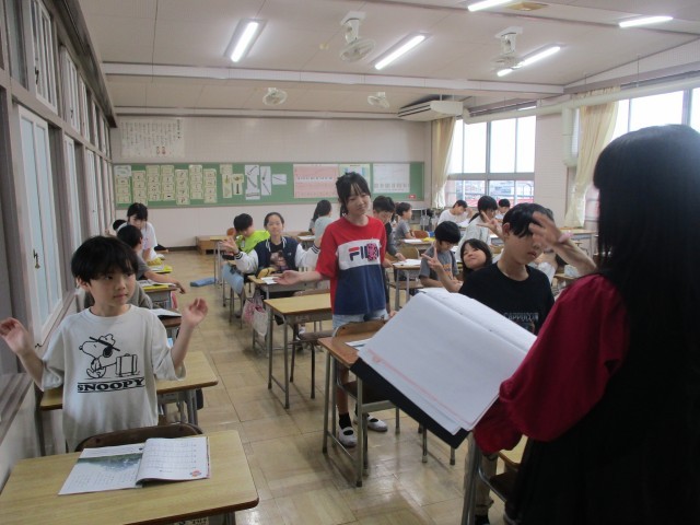 音楽室をのぞくと、「ゆかいに歩けば」「まきばの朝」の音楽を学習していました。歌唱や指揮で曲想を感じながら、音楽活動を楽しんでいました。