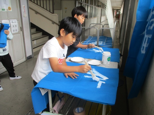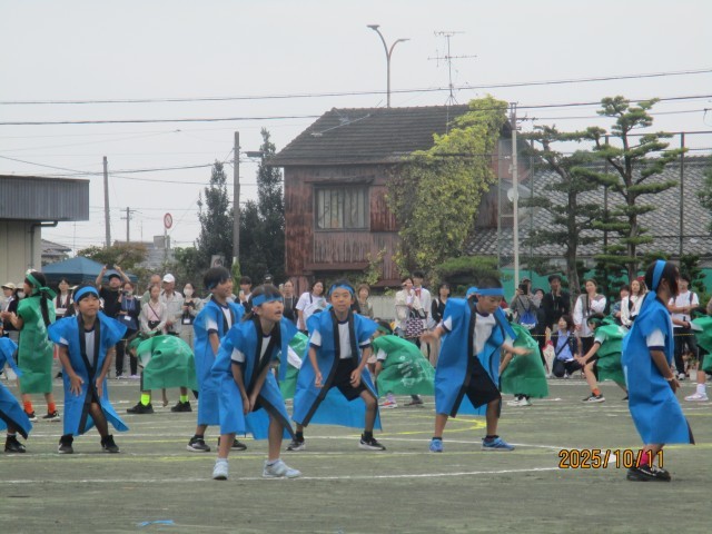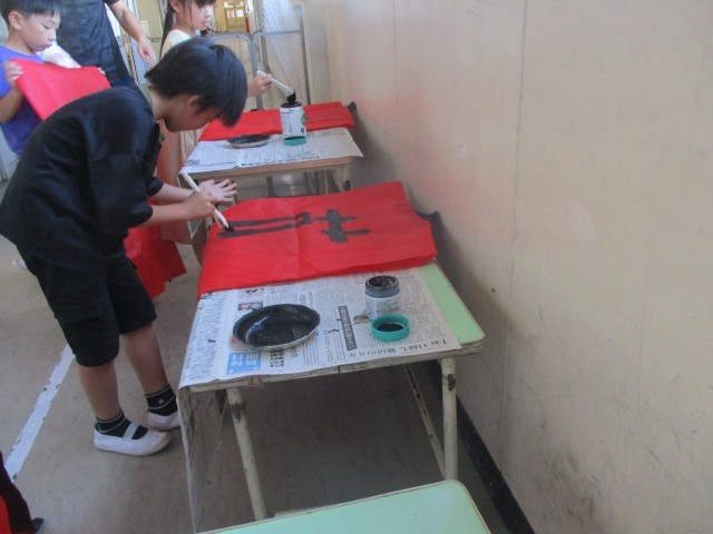 ソーラン節では、今までの練習の成果が発揮できました。かけ声も揃っていました。準備では、法被の背中に、思いをこめて文字を書きました。今年は3.4年合同のため、迫力のある演技になりました。