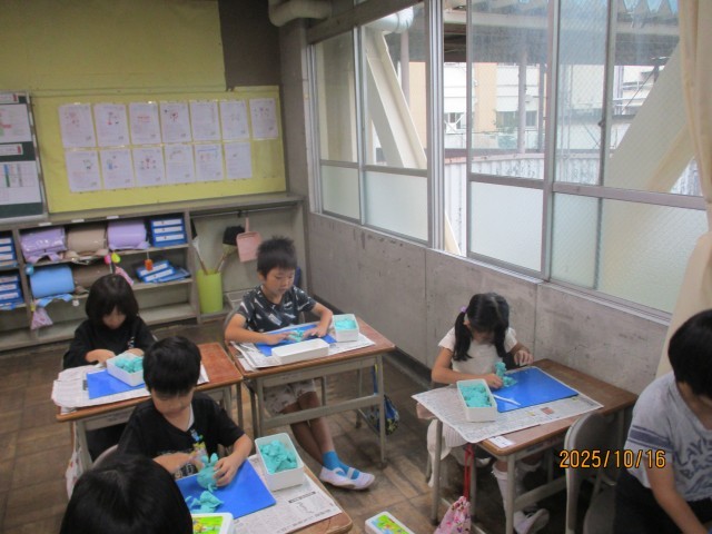 今日、図工の時間に「いっしょにおさんぽ」という教材で粘土を使って作品を作りました。誰とどこに散歩に行きたいかをイメージしながら作品作りをしました。楽しく作ることができました。