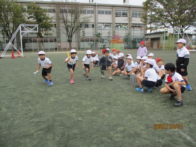 体育の授業で『リレーあそび』に取り組んでいます。バトンの渡し方や声のかけ方などを工夫して、速く渡せるようにしています。
