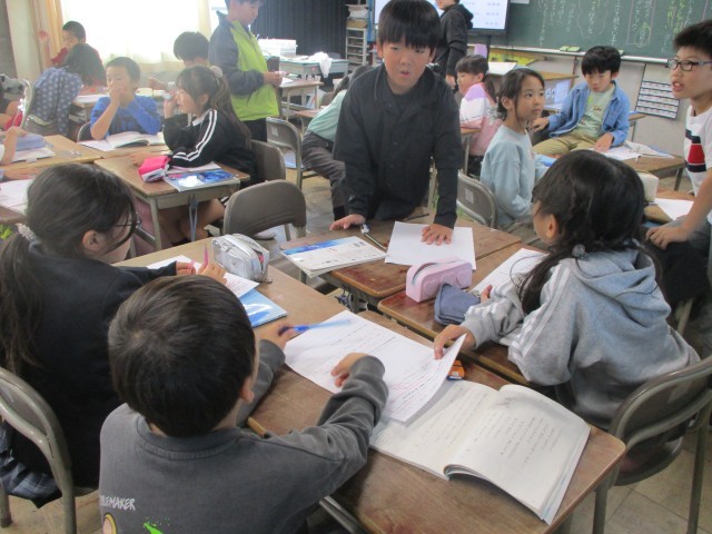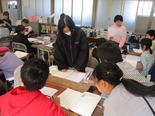 「ちいちゃんのかげおくり」の学習の様子です。第5場面の役割について考え、グループで話し合いました。友達の意見をうなずきながら聞き、自分の考えを深めていました。