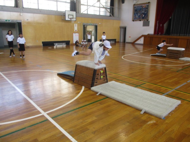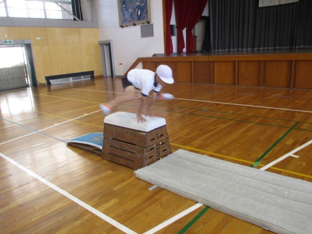 体育では、とび箱を学習しています。とび方のポイントをおさえてとぶことができていました。