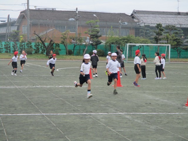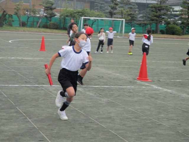 体育の時間にリレーの練習をしています。バトンの持ち方、渡し方を工夫し、より速く走れるように話し合いながら、チームみんなでがんばっています。