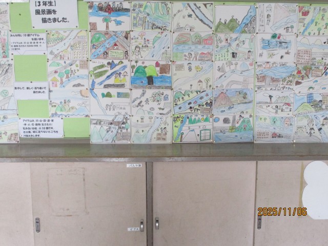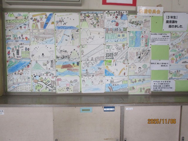 3年生が10個のアイテムを使いすてきな風景画を描きました。45分間の授業で集中し、楽しく、落ち着いて描きました。みんな同じアイテムを使ったのに、みんな違う絵になりました。そして、物語を作っている子もいました。東昇降口に掲示してあります。学校公開の際にご覧ください。