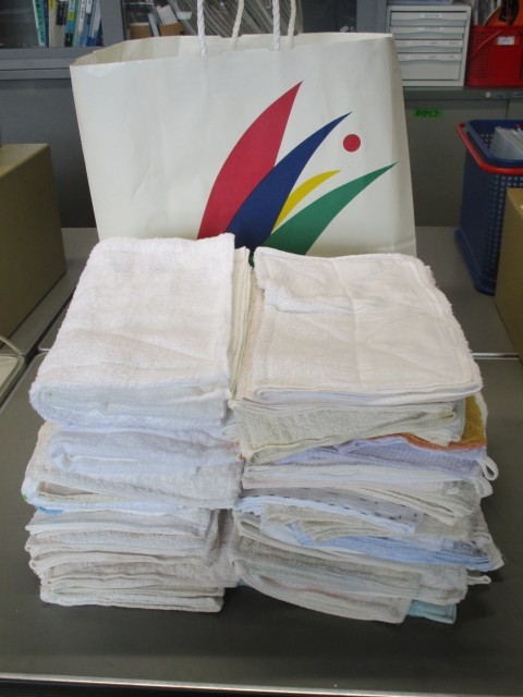 今年も北方連区老人クラブ連合会の皆様より、こんなにたくさんの雑巾を寄付していただきました!この雑巾を使って、みんなで学校をきれいにしていきたいと思います。老人クラブの皆さん、ありがとうございました。