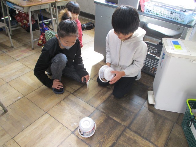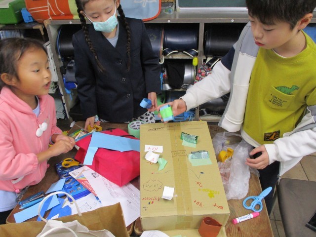 「うごくうごくわたしのおもちゃ」の学習で、同じおもちゃを作るグループで、相談しながらおもちゃを作っています。どうしたらよく動くおもちゃになるか、考えを出して、試しています。