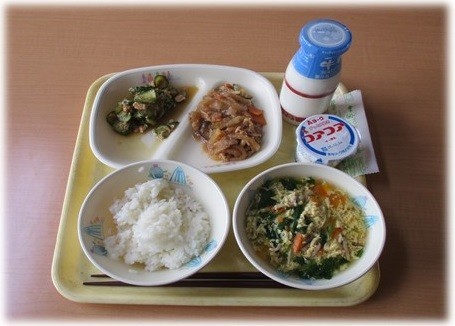 今日の献立は、ごはん、牛乳、梅味ぶたこまだいこん、きゅうりのツナ和え、かきたま汁、ヨーグルトです。