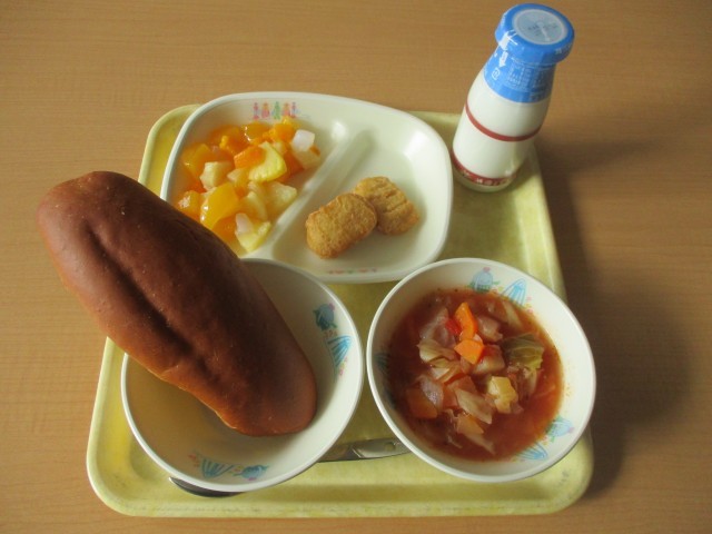 今日の献立は、黒ロールパン、牛乳、チキンナゲット、みかんゼリー和え、ミネストローネです。